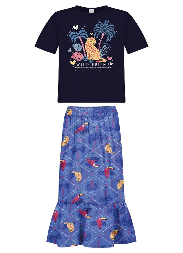 Alakazoo - Conjunto com Blusa e Saia Midi Estampada Azul