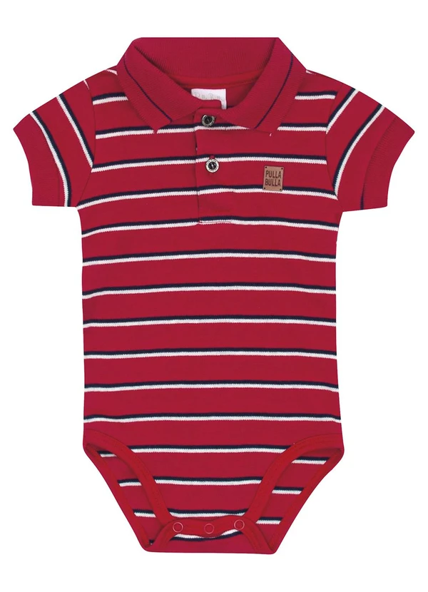 Body bebê masculino confeccionado em suedine fio tinto listrado na cor vermelho, proporciona conforto e um visual clássico. O modelo possui gola polo com abertura de botões, além de botões entre as pernas que facilitam a troca e oferecem maior liberdade de movimentação. Como detalhe especial, conta com um aplique termocolante próximo ao peito com a identificação da marca Pulla Bulla. Ideal para compor looks charmosos e práticos para o dia a dia.