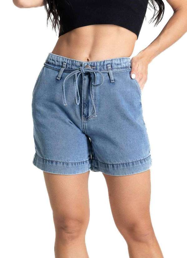 Shorts confeccionada em jeans. Modelagem soltinho. Cintura média Fechamento com botão e zípe rcós acompanha um cordão para amarração Bolsos frontais faca e bolsos traseiros funcionais Barra simples Tecido: Jeans Tipo de lavagem: Azul Cor: Azul médioComposição: 100% ALGODÃO