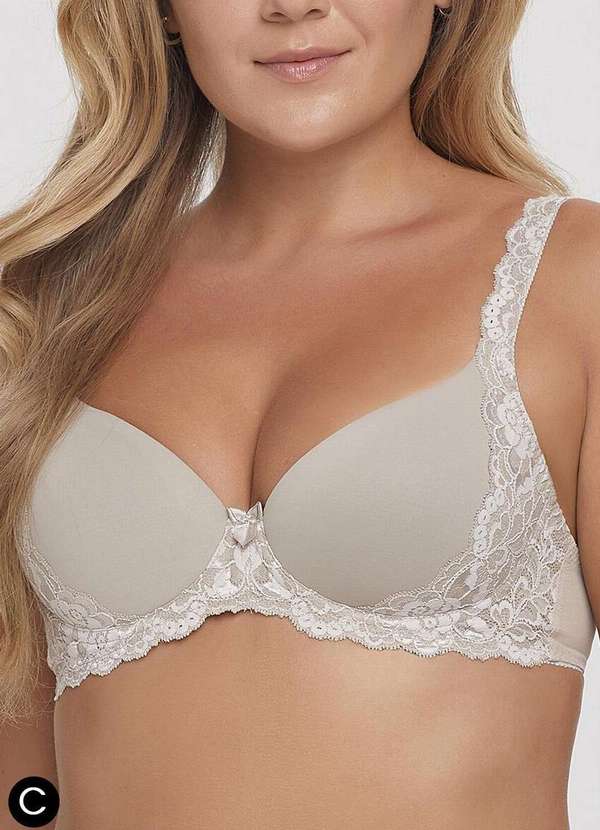 Características: Sutiã com aro e bojo. Renda no busto e nas alças. Modelagem com alças largas e acolchoadas. Barbatanas nas laterais, bojo stretch que não deforma o aro. Outros Detalhes: Taça C Composição: Corpo: 79% Poliamida e 21% Elastano. Renda: 89% Poliamida e 11% Elastano. Bojo: 90% Poliamida e 10% Elastano. Reforço:100% Poliamida. Forro: 100% Poliéster.