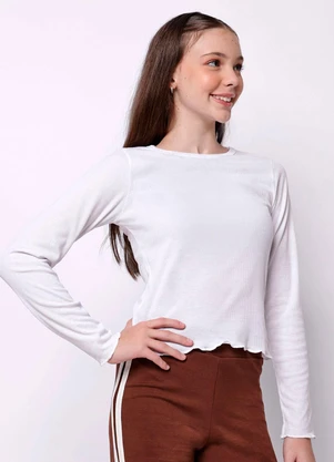 Blusa Juvenil Canelada Manga Longa Frufru Branca