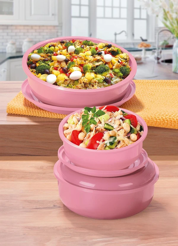 Composto por: 1 kit 3 potes redondos em plástico polipropileno. Cap.: 400 mL,680 mL e 1.100 mL. Imagens meramente ilustrativas.