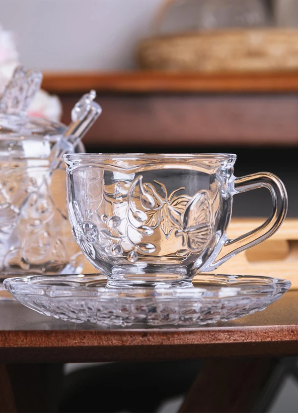 1 Xícara com pires em cristal ecológico com relevo de borboletas.