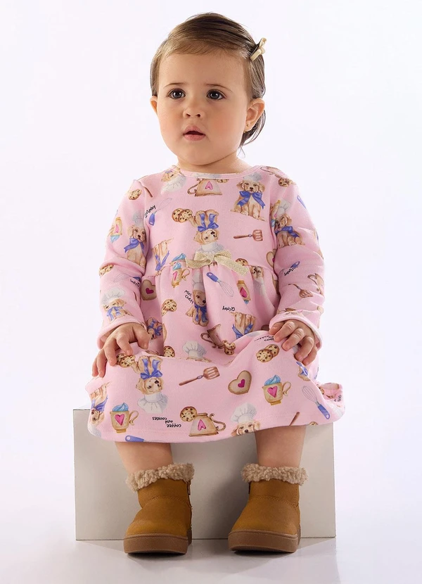 Quimby - Vestido Bebê em Suedine Manga Longa Bege