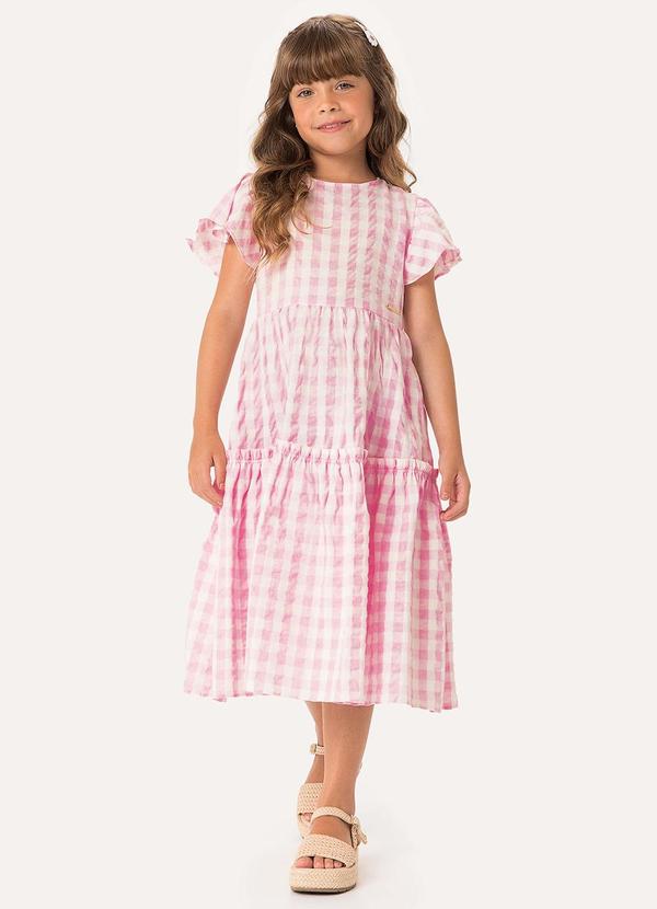 Carinhoso - Vestido Vichy Mídi em Anarruga Rosa Claro