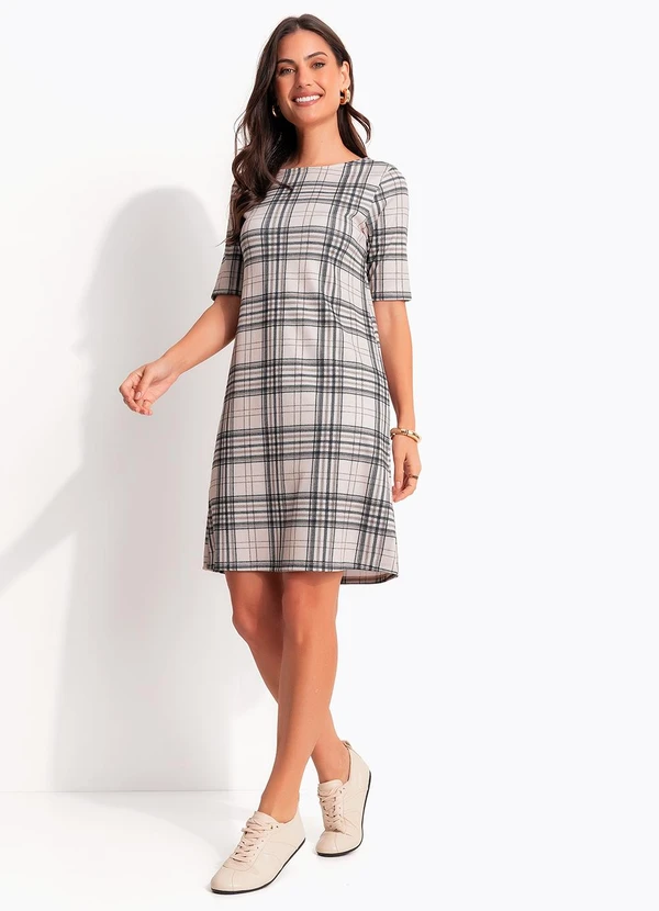 vestido xadrez, vestido ribana canelada, vestido que não marca, moda feminina casual, vestido evasê curto, roupa que não amassa, vestido com fenda, vestido manga cotovelo